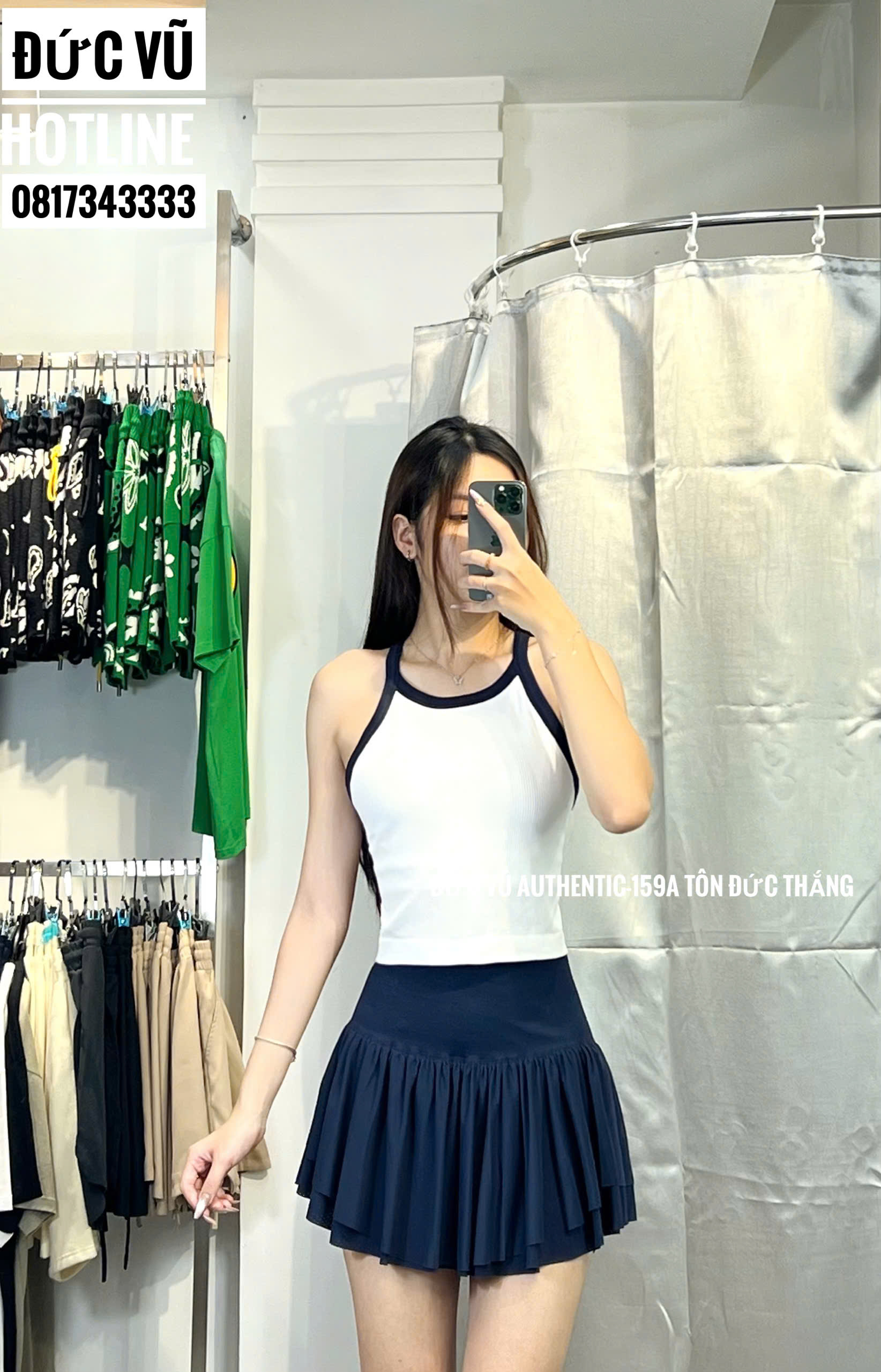 Áo croptop dáng thể thao: Form ôm vừa vặn, cổ yếm khỏe khoắn, phối màu trắng tinh khôi với viền xanh navy tạo điểm nhấn thanh lịch. Chất vải co giãn, thoáng khí, phù hợp cho mùa hè.
