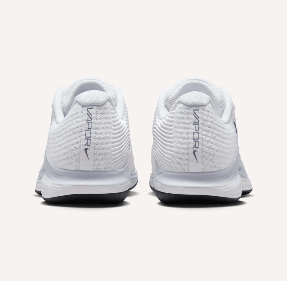 • Mẫu giày tennis chính hãng Nike, phiên bản Court Air Zoom Vapor Pro 2, nổi bật với phối màu trắng tinh tế kết hợp logo Swoosh xanh navy mạnh mẽ.