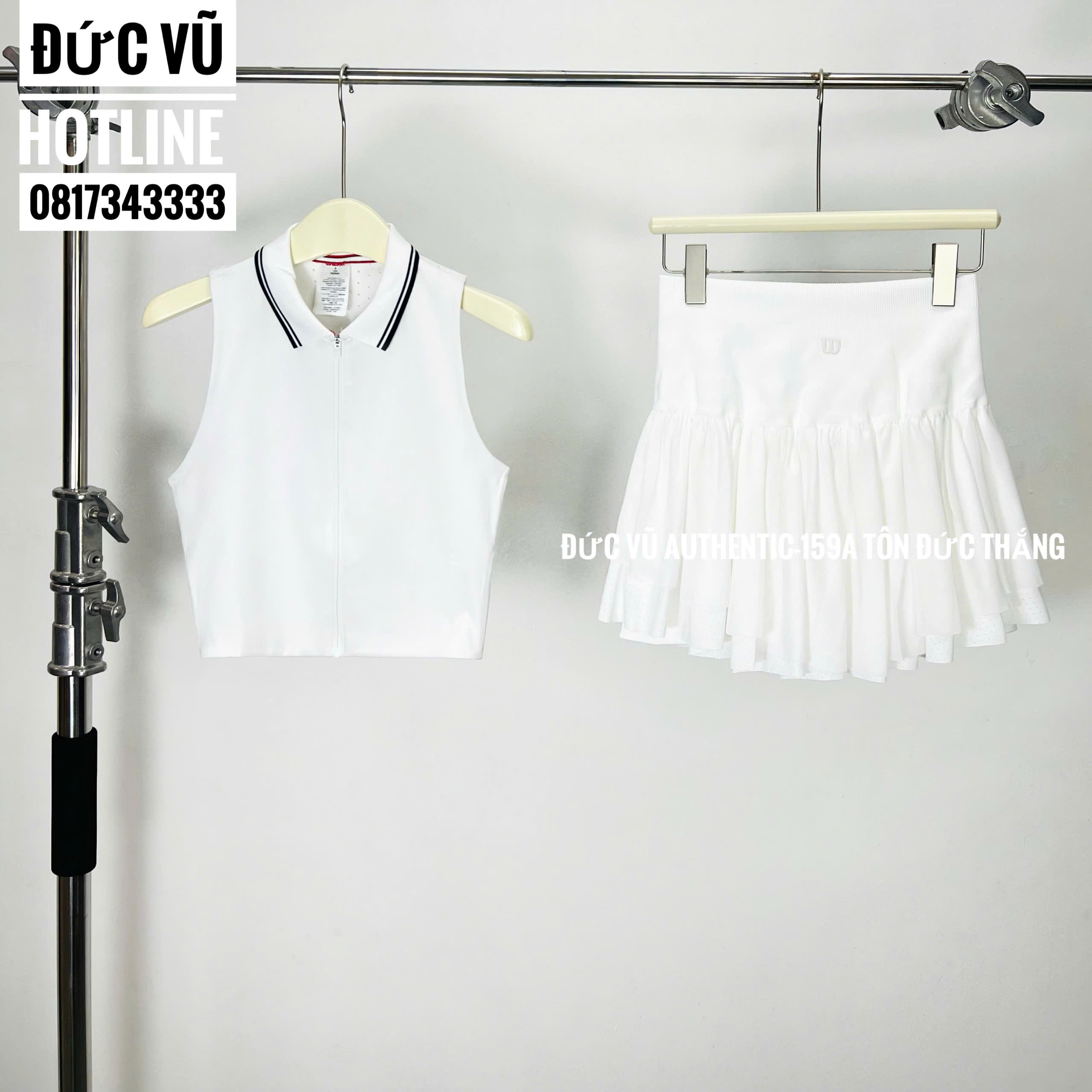 Set đồ gồm áo không tay thiết kế cổ bẻ phối viền đen thanh lịch, khóa kéo trước hiện đại, mang lại vẻ thể thao nhưng vẫn thời trang. Phối cùng chân váy xếp ly thương hiệu Wilson, thiết kế cạp chun có logo và viền sọc thể thao tạo điểm nhấn trẻ trung. Chất vải co giãn, thấm hút tốt, mang lại cảm giác thoải mái khi vận động.