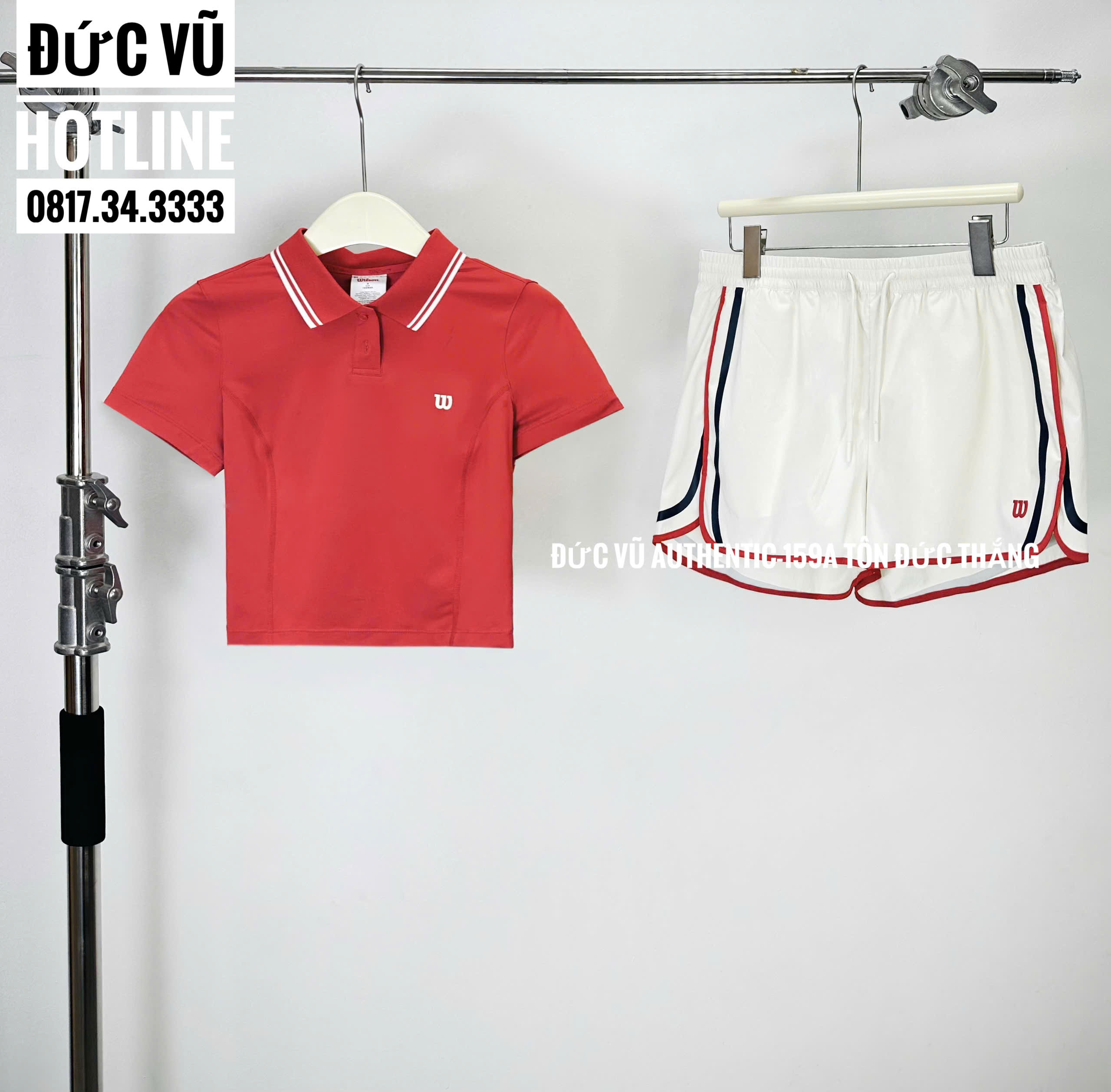 Áo polo: Chất liệu thể thao co giãn 4 chiều, thấm hút mồ hôi tốt, màu đỏ nổi bật, cổ và tay áo viền sọc trắng thể thao, logo “W” tinh tế trước ngực.