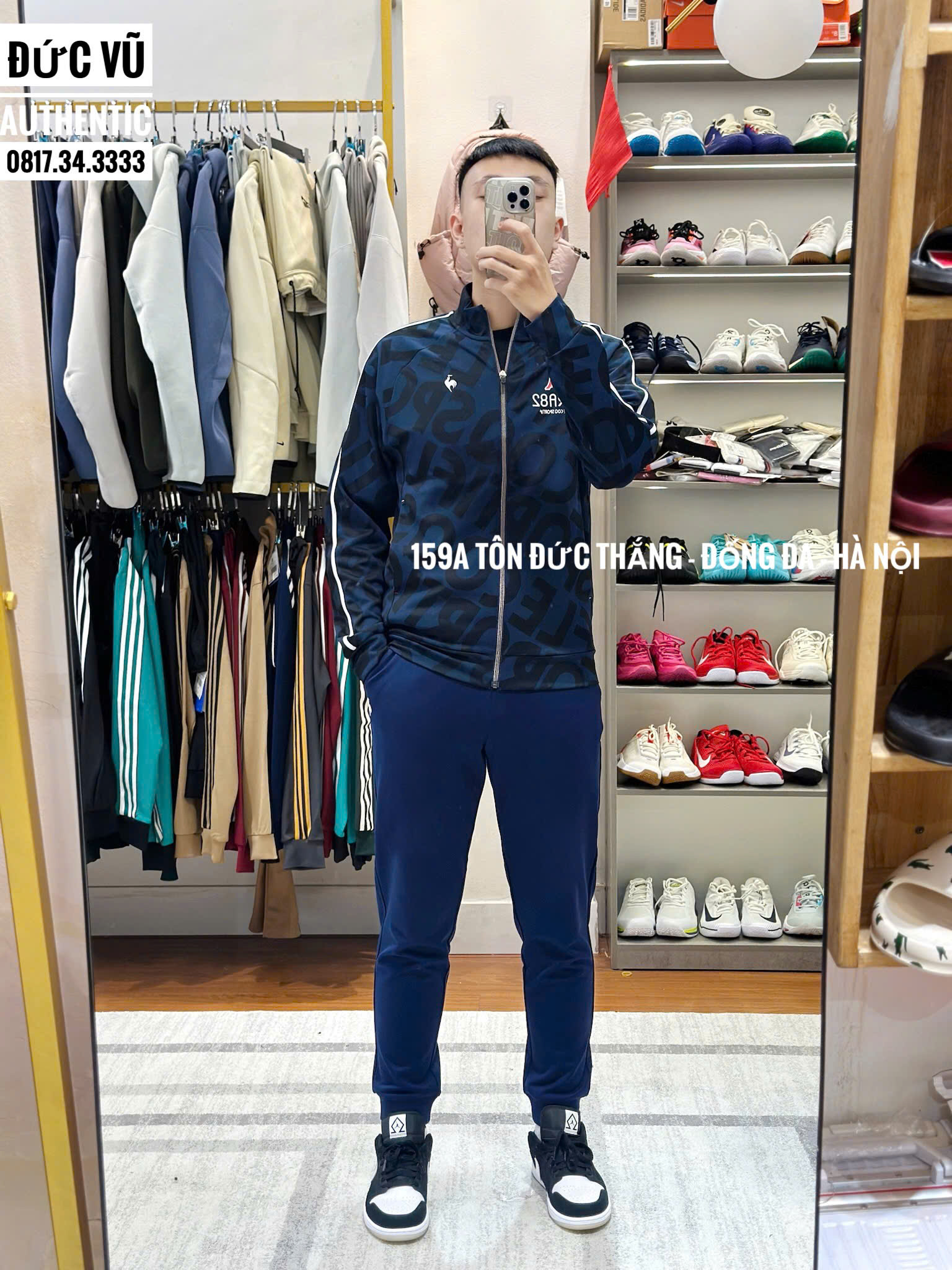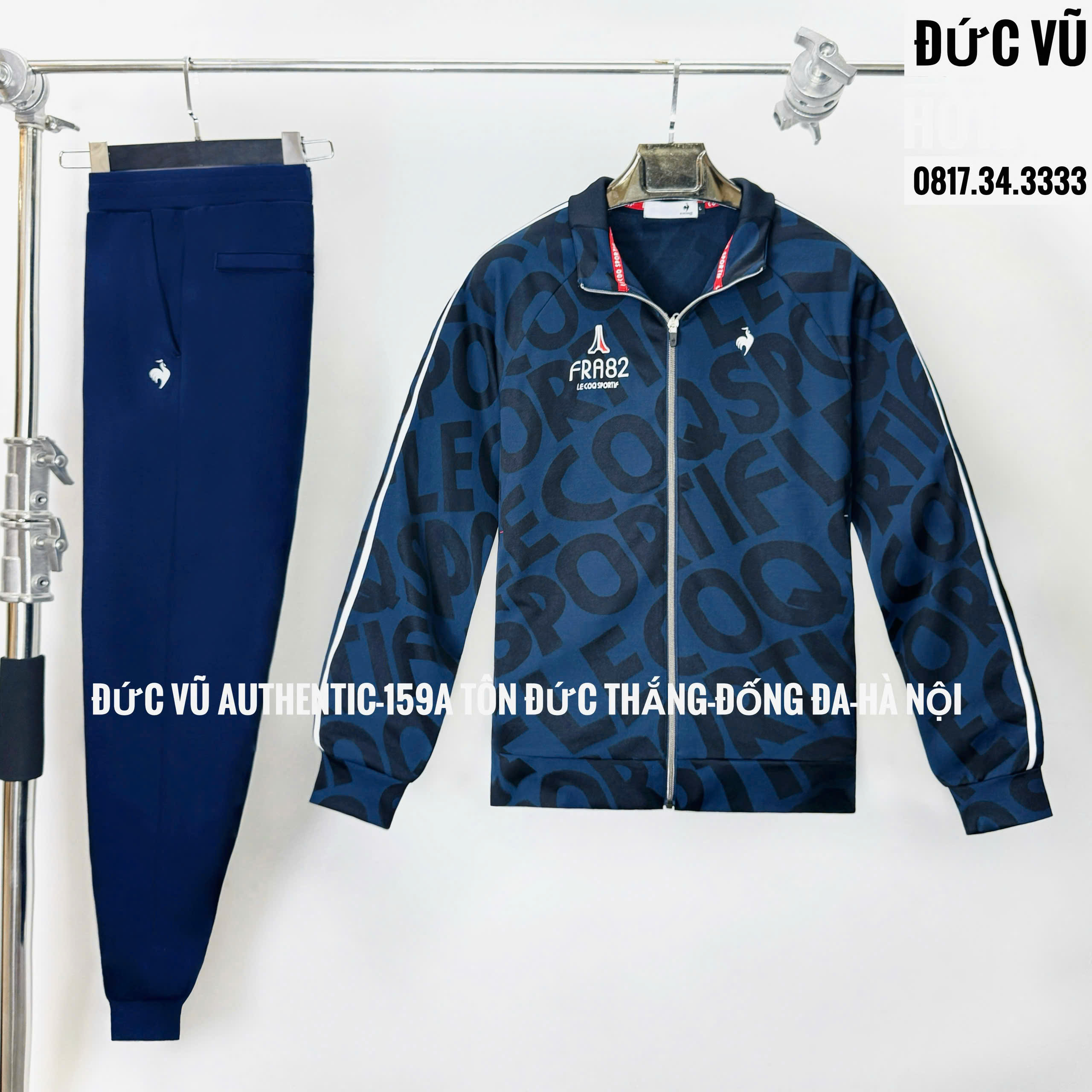 Set gồm áo khoác thể thao khóa kéo và quần jogger đồng bộ. Áo thiết kế nổi bật với tông trắng xám phối logo FR82 và chữ Le Coq Sportif in tràn thân, mang phong cách năng động và hiện đại. Tay áo có sọc chạy dọc tạo điểm nhấn thể thao. Quần jogger đen trơn, dáng slim fit, co giãn nhẹ, tạo cảm giác thoải mái khi vận động.