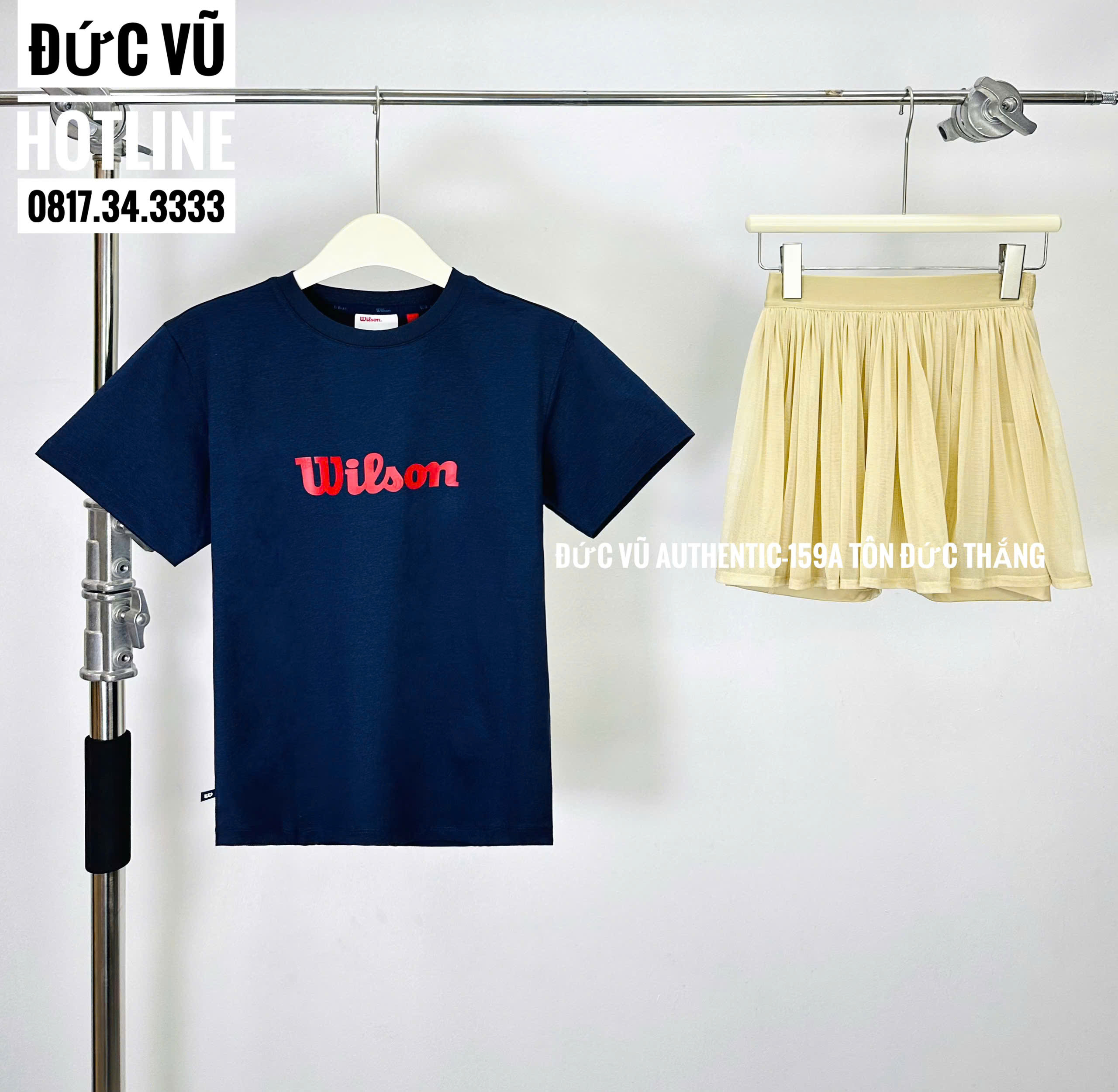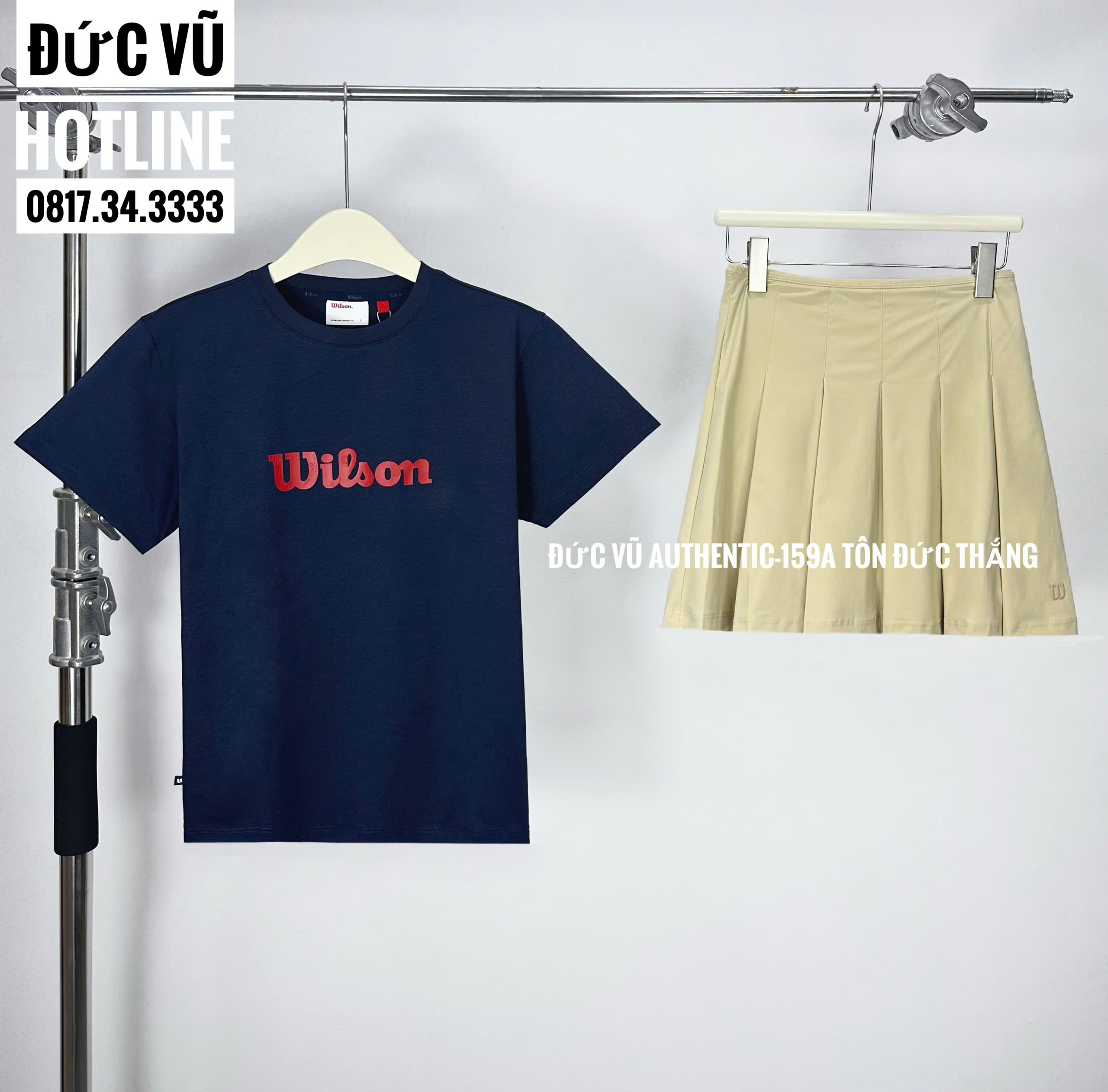 Set gồm áo thun nữ màu xanh navy với chữ logo Wilson đỏ nổi bật kết hợp cùng chân váy tennis xếp ly màu beige. Thiết kế mang đậm phong cách thể thao năng động nhưng vẫn nữ tính, thanh lịch.